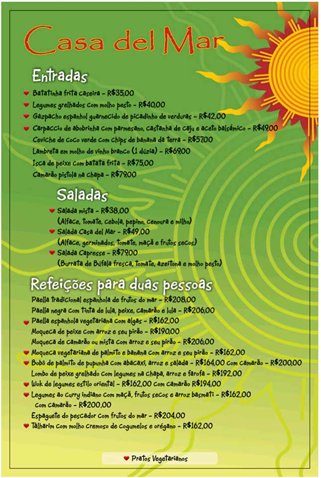 A Paella espanhola ou a Moqueca baiana com leite de coco e azeite de dendê, são algumas das opções oferecidas. Também conta com uma variedade de saborosos pratos vegetarianos e veganos, drinques diversos, sucos de frutas da estação e detox.