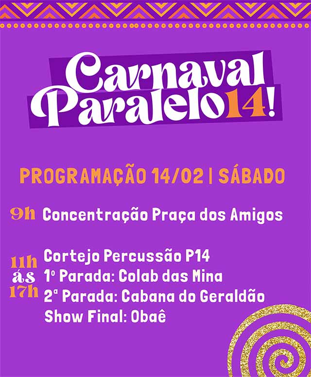 Carnaval Paralelo 14! Sábado, 14/02 tem cortejo do Bloco Paralelo 14 com muitos convidados especiais em Algodões. Concentração na Praça dos Amigos a partir das 09h, seguindo até o Obaê com duas paradas estratégicas no caminho e muita folia!