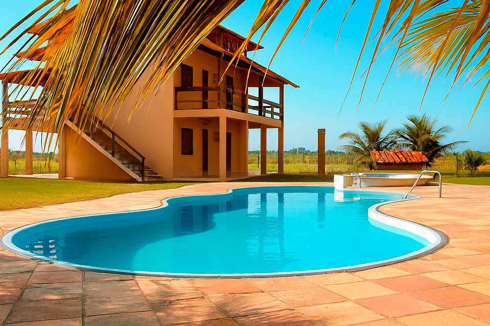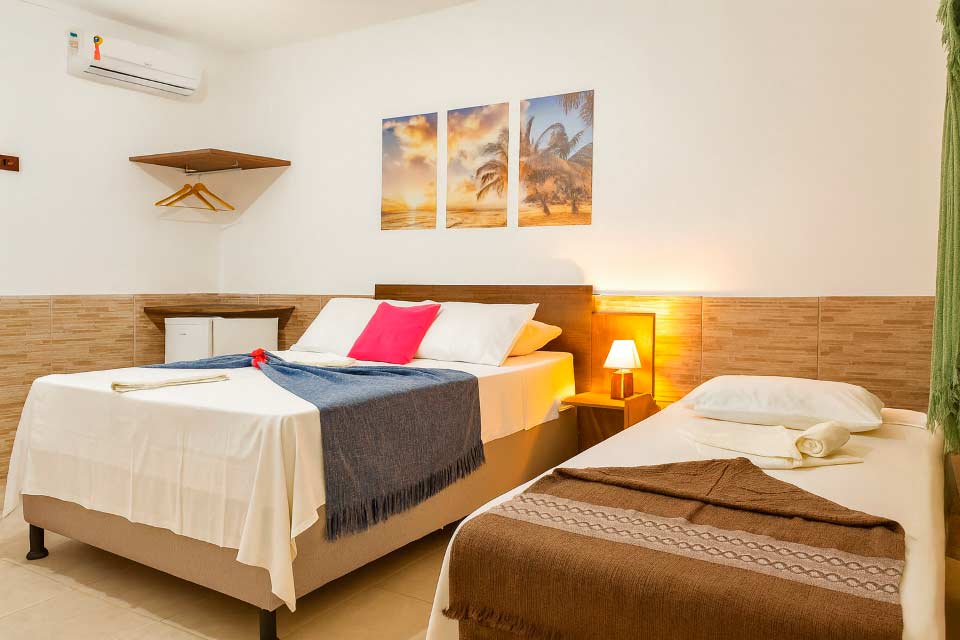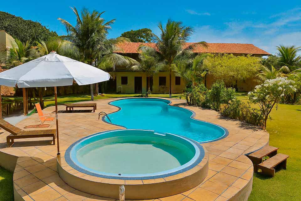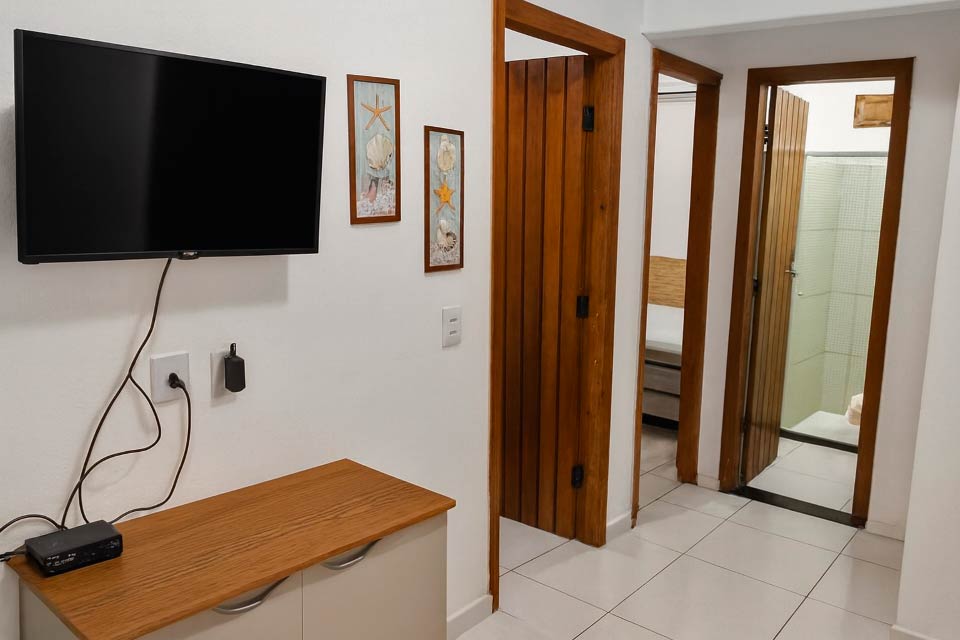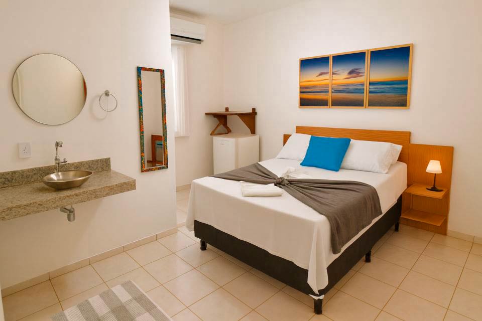 As suítes são equipadas com ar-condicionado split, TV HD e frigobar, e os flats possuem cozinha completa e varanda com rede. Bar e restaurante à piscina, hidromassagem ao ar livre, Wi-Fi e estacionamento interno.