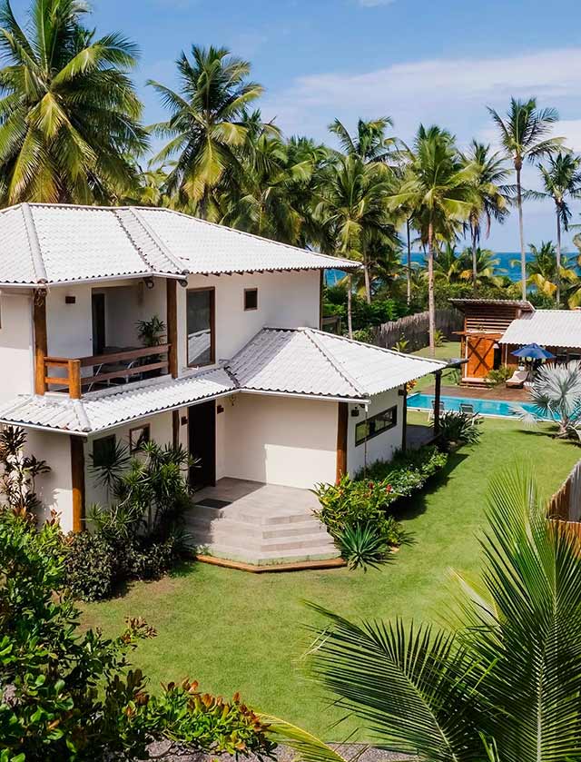 Possui dois espaços: Casa de 4 suítes com sala, cozinha, banheiro social, e um anexo com duas suítes extras. Recebe até 16 hóspedes. E um bangalô exclusivo a beira mar.